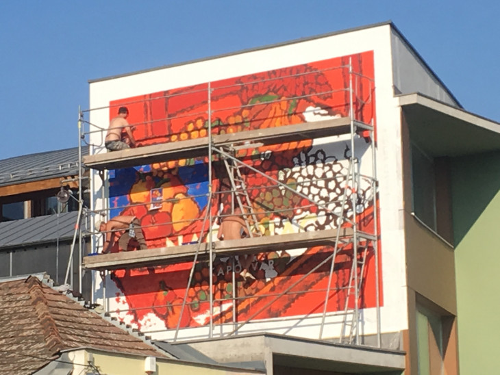 A napokban állhattak neki az alkotásnak, ami mára teljesen kirajzolódott a piac tűzfalán. Nem tudjuk ki felelős az óriási műért, de a festmény az Rippl-Rónai - Szőlős csendélet című munkája.