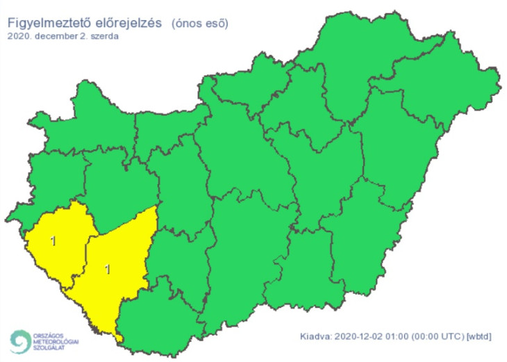 Két megyére - Somogyra és Zalára is elsőfokú figyelmeztetést adott ki az OMSZ a délutántól érkező ónos eső miatt.