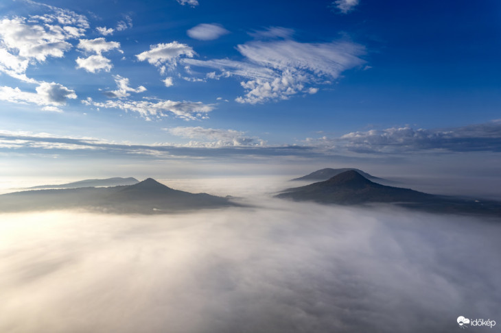 A magasból készített látványos felvételeket Somogyi László készítette a ködből kibukkanó Balaton-felvidék színes csúcsairól. Fentről a köd hófehér, a tanúhegyek pedig őszi színekben tündökölnek - írja az Időkép.